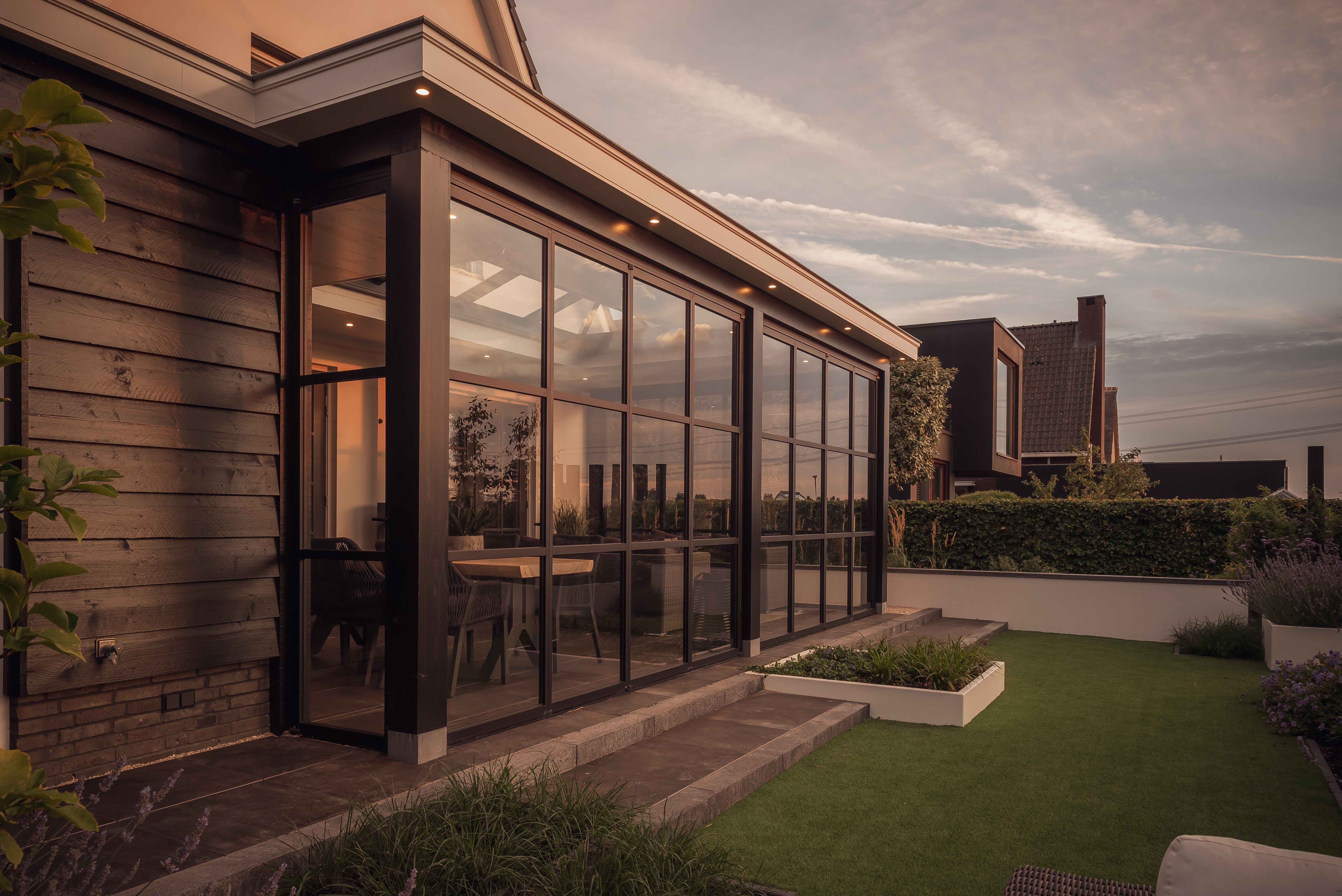 De slanke en stevige profielen van onze glaswanden worden in eigen beheer vervaardigd uit duurzaam aluminium – een hoogwaardig, lichtgewicht metaal dat niet roest. Deze eigenschappen maken het materiaal uitermate geschikt voor buitentoepassingen zoals ramen en deuren. Bovendien zijn de technische mechanismen subtiel geïntegreerd in de raamstijlen en het framewerk, iets wat met staal of hout nauwelijks mogelijk zou zijn.