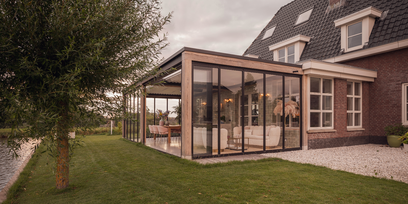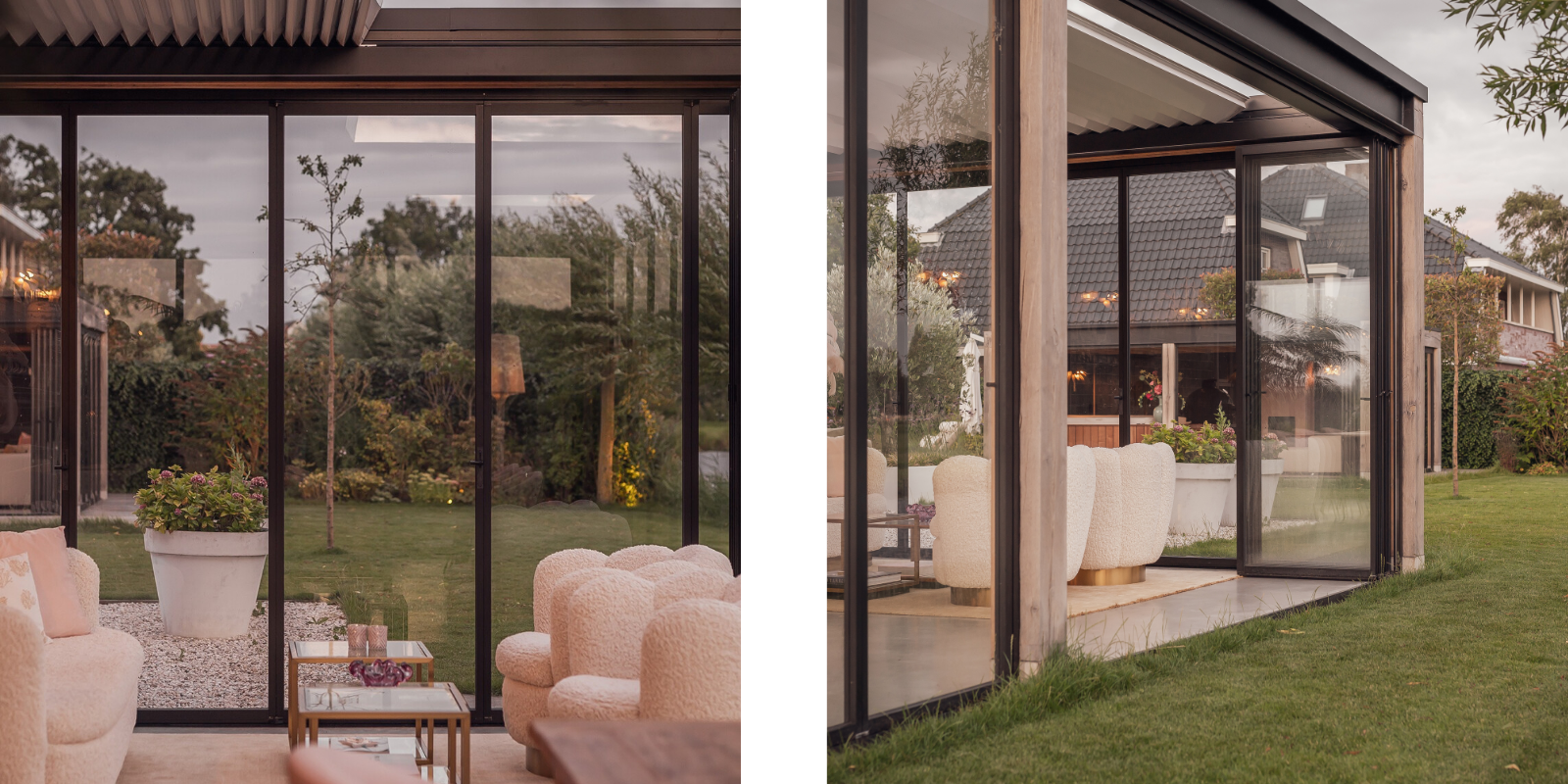 Voor deze luxe buitenkamer gerealiseerd met Buitenpracht, plaatsten we R5 vouwwanden met dubbel glas. De wanden vouwen naar binnen en bieden een flexibele, winddichte afsluiting met schitterend uitzicht op de tuin.