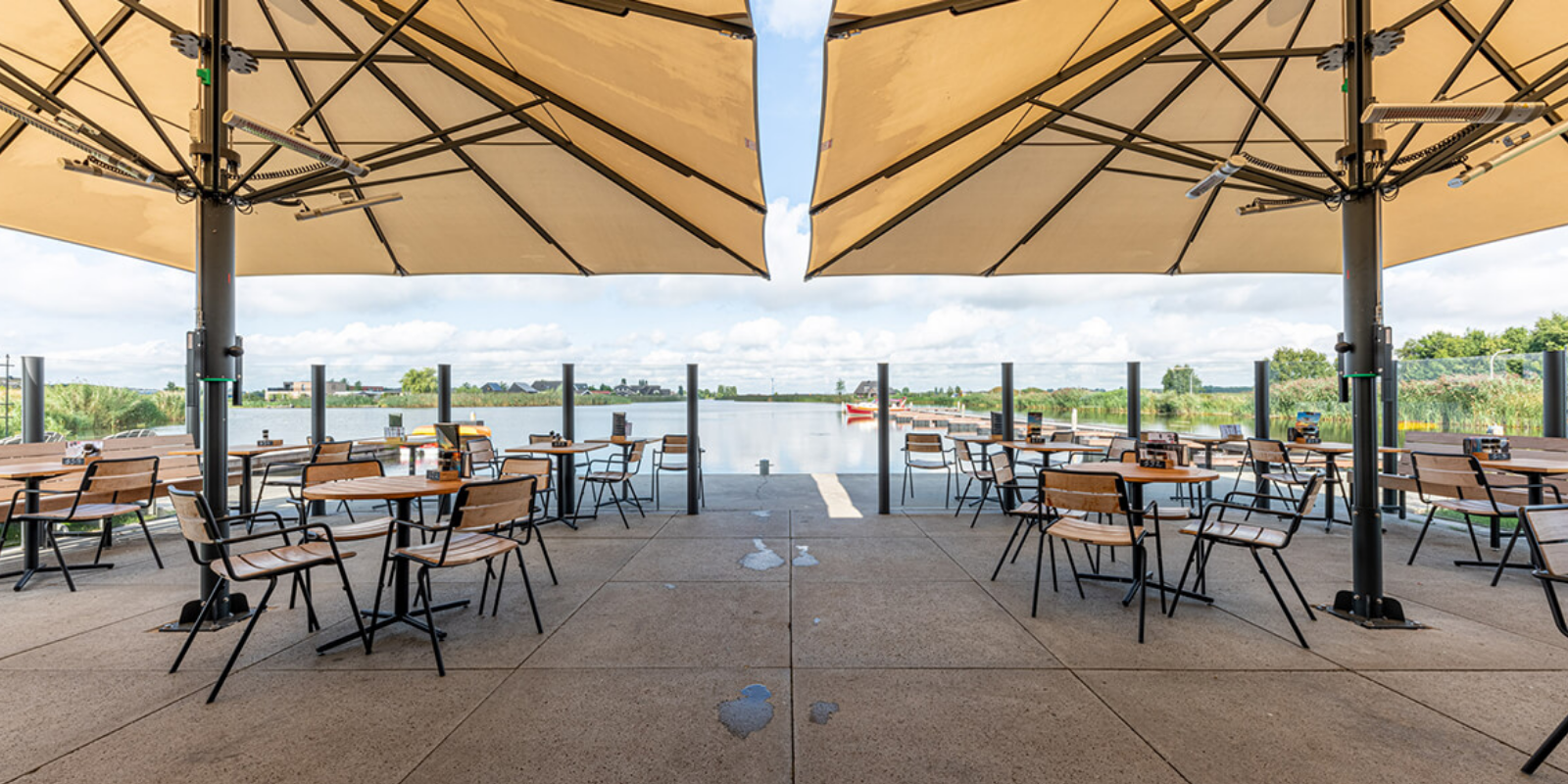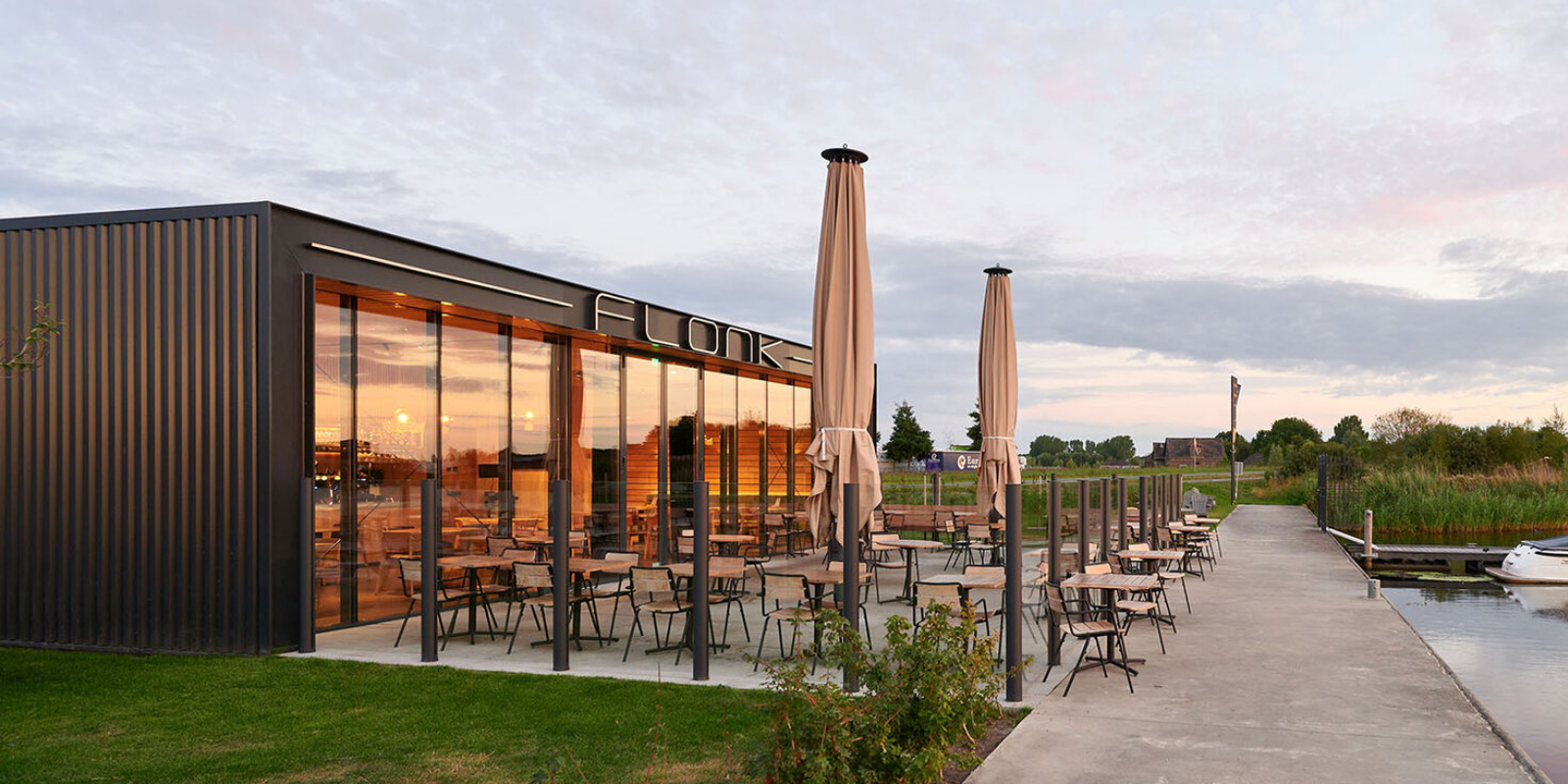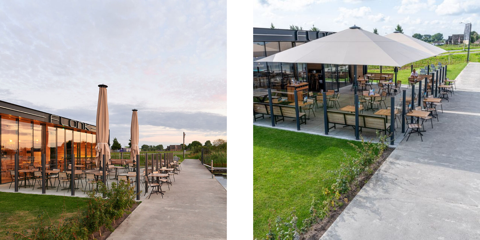 Bij Paviljoen Flonk in Finsterwolde plaatsten we, in samenwerking met +PEIL Architecten uit Groningen, strakke windschermen. Het minimalistische ontwerp sluit naadloos aan bij de industriƫle uitstraling van het door +PEIL ontworpen pand en zorgt voor een stijlvolle, comfortabele buitenruimte waar gasten beschut kunnen genieten.