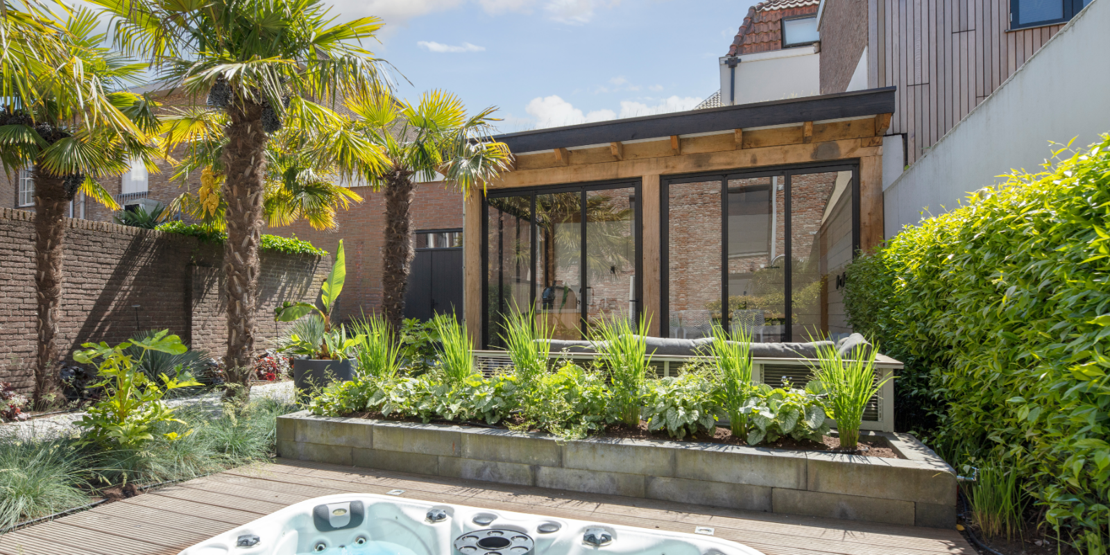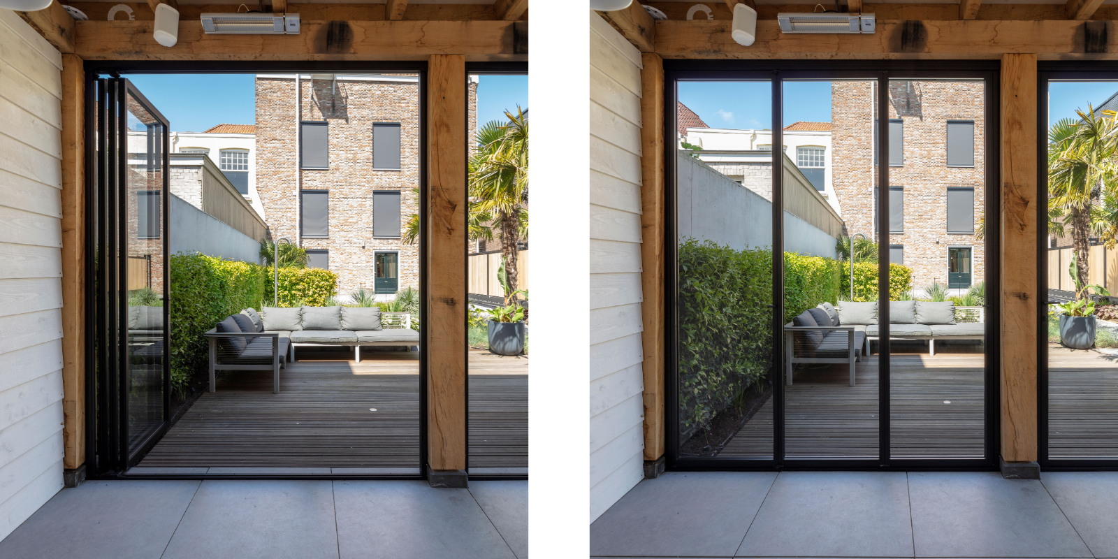 Voor deze tuinkamer in Gorinchem plaatsten we R4 vouwwanden met panelen van 60 cm breed. De zwarte profielen sluiten perfect aan op het eikenhout en geven de stadstuin een open en beschutte uitstraling.