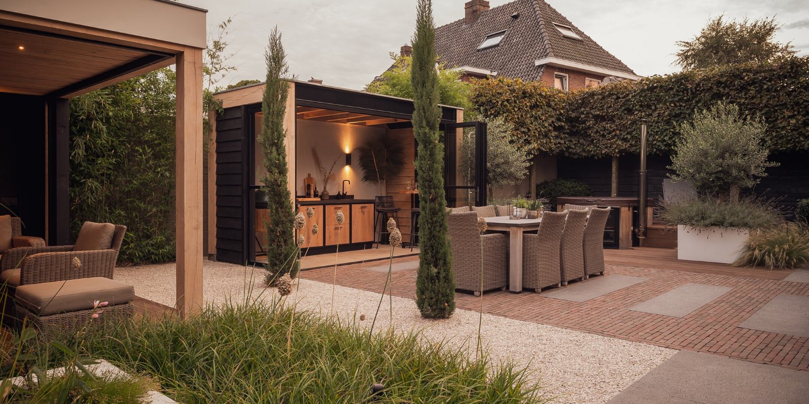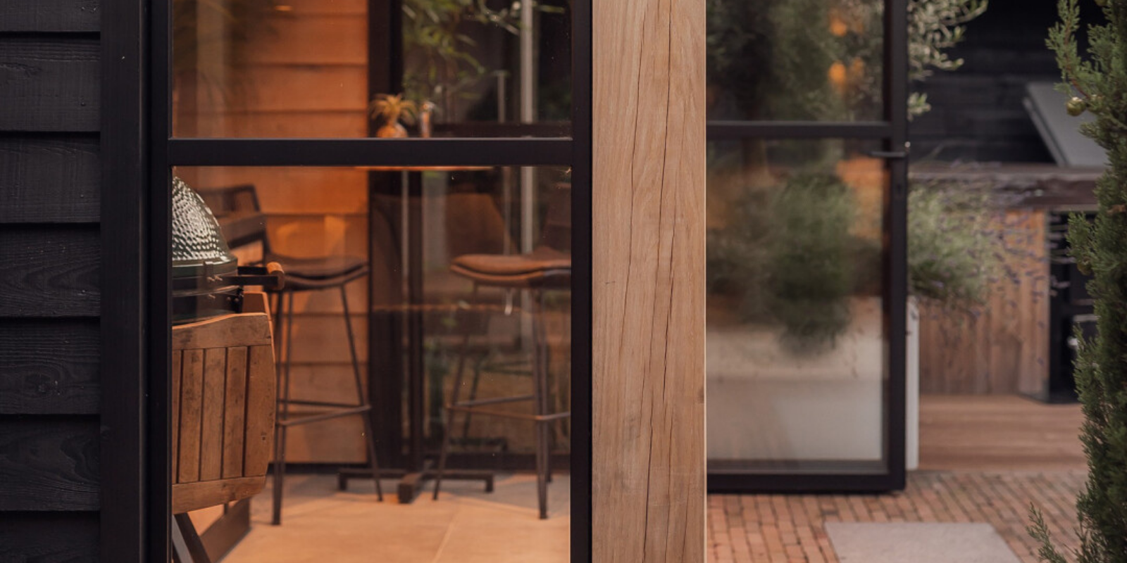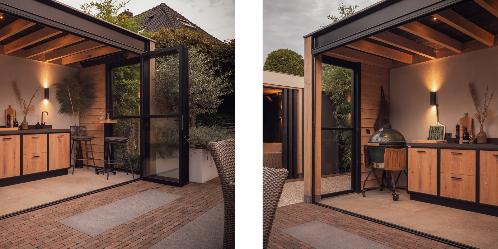 Voor deze moderne overkapping ontworpen in samenwerking met Borley, plaatsten we een R4 vouwwand gecombineerd met twee vaste panelen. Hierdoor is de buitenkeuken afsluitbaar en in elk seizoen te gebruiken.