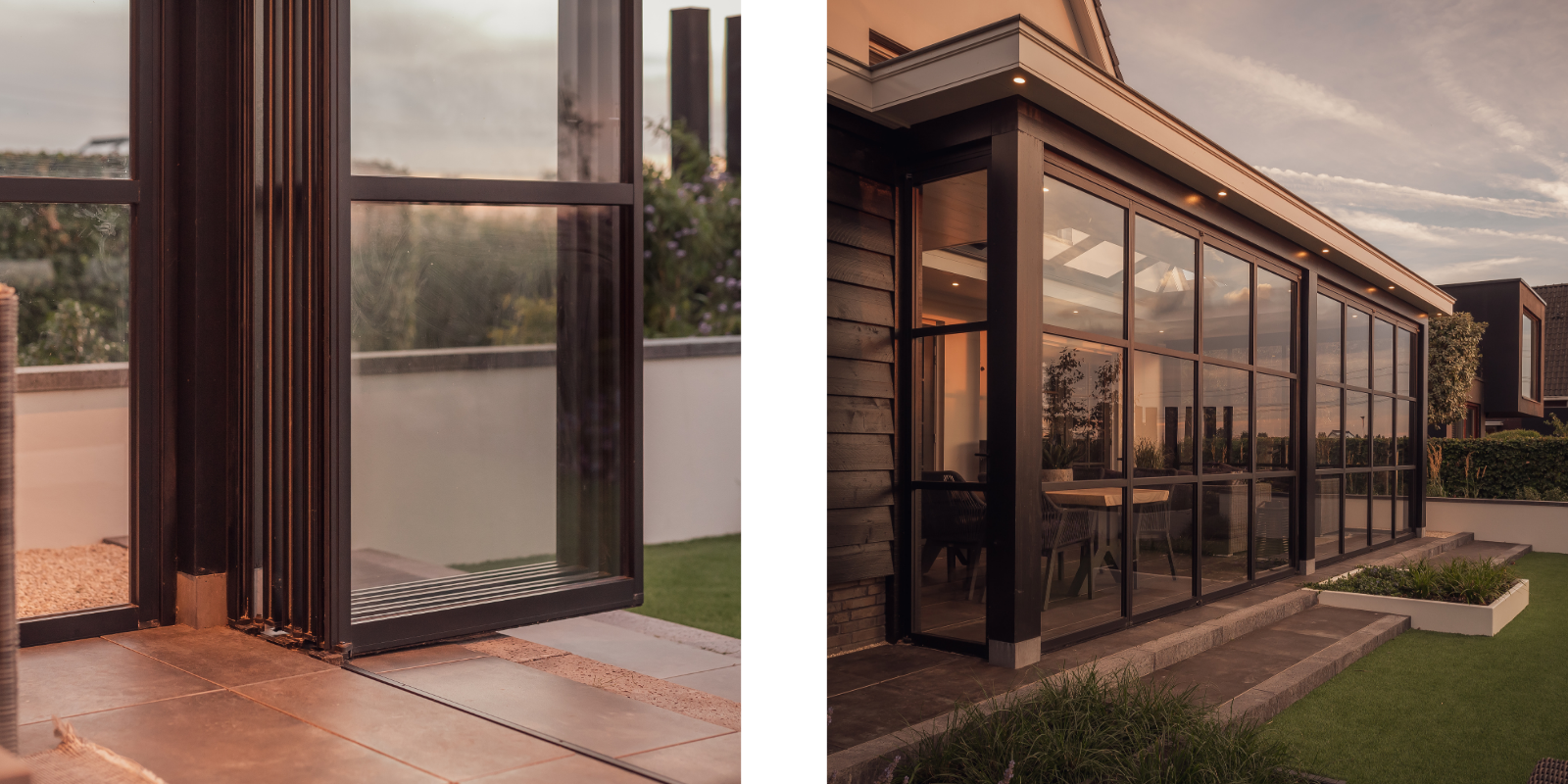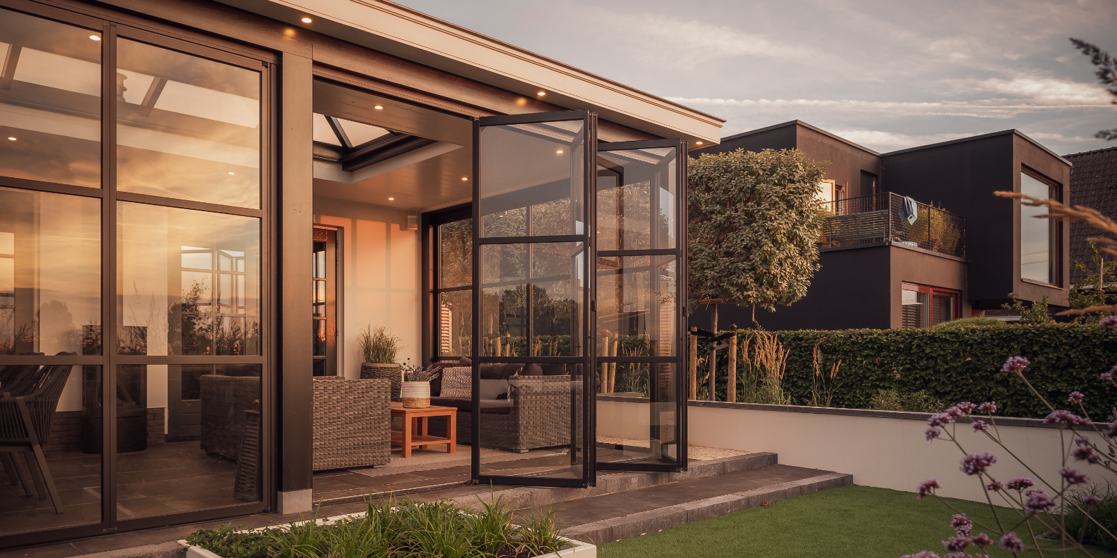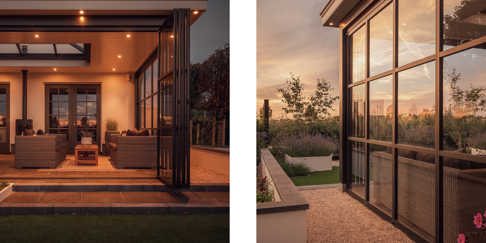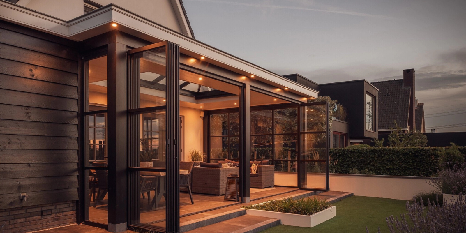 Voor deze moderne tuinkamer aan huis, gebouwd door Buitenpracht, plaatsten we twee vouwwanden met elk vier panelen en twee vaste wanden. De strakke lijnen en royale lichtkoepel creƫren een lichte, open ruimte die naadloos overgaat in de tuin. Zo ontstaat een stijlvolle plek om het hele jaar door van buiten te genieten.
